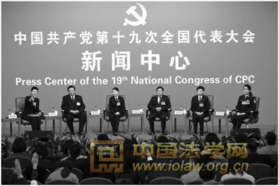10月19日,中国共产党第十九次全国代表大会新闻中心举行主题为“推进全面依法治国”的集体采访活动,上海市浦东新区人民检察院公诉二处检察官施净岚(左三)等五位来自政法系统的代表接受采访。 新华社发